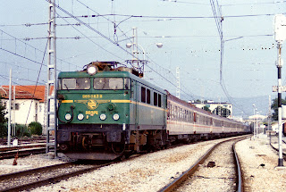 7 // Los impresionantes coches Corail franceses, precedidos de un RRR 8.000 con bogie GC en cabeza al principio, a modo de "cabestro" por una cuestión de rigidez en los topes de las locomotoras Renfe, luego subsanado.